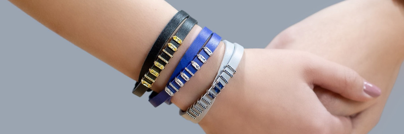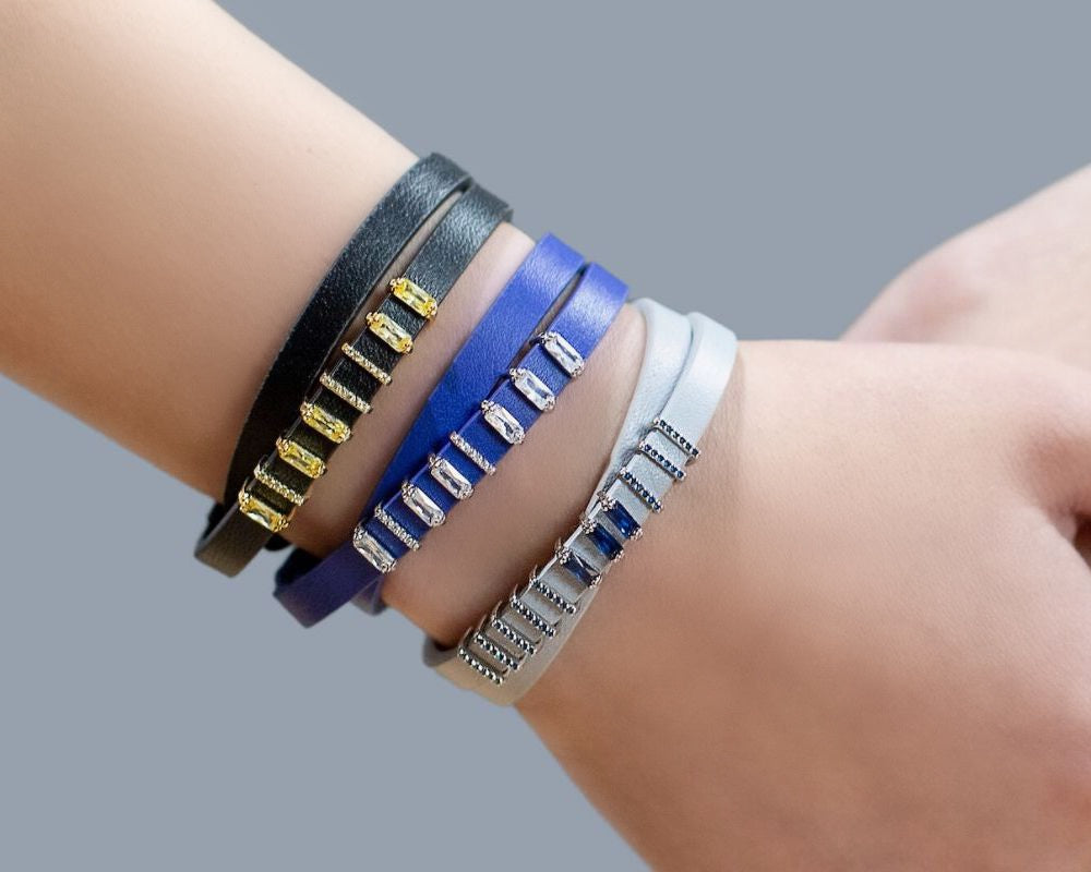 For the Casual and Denim Lover: Grey leather with sapphire charms brings a touch of sophistication to everyday jeans, elevating a casual look with a hint of color.